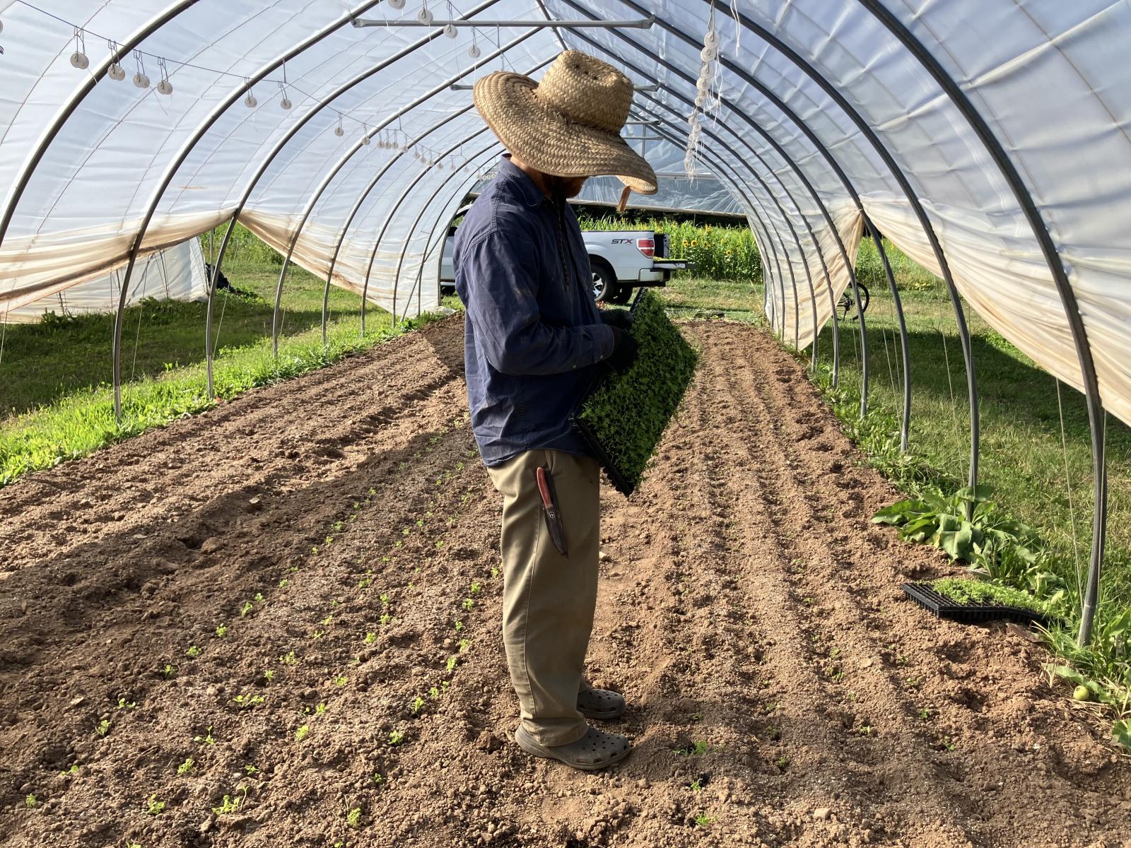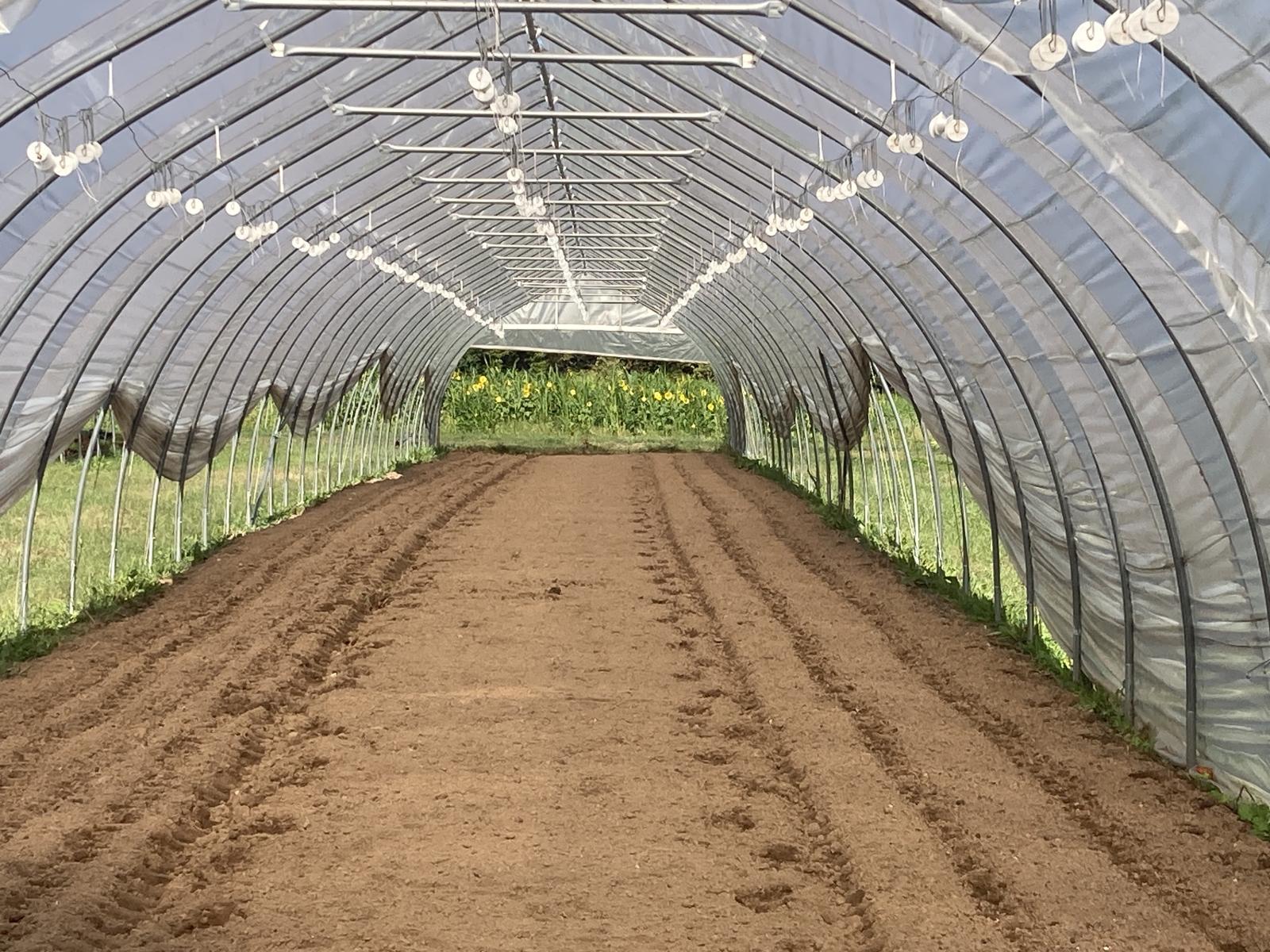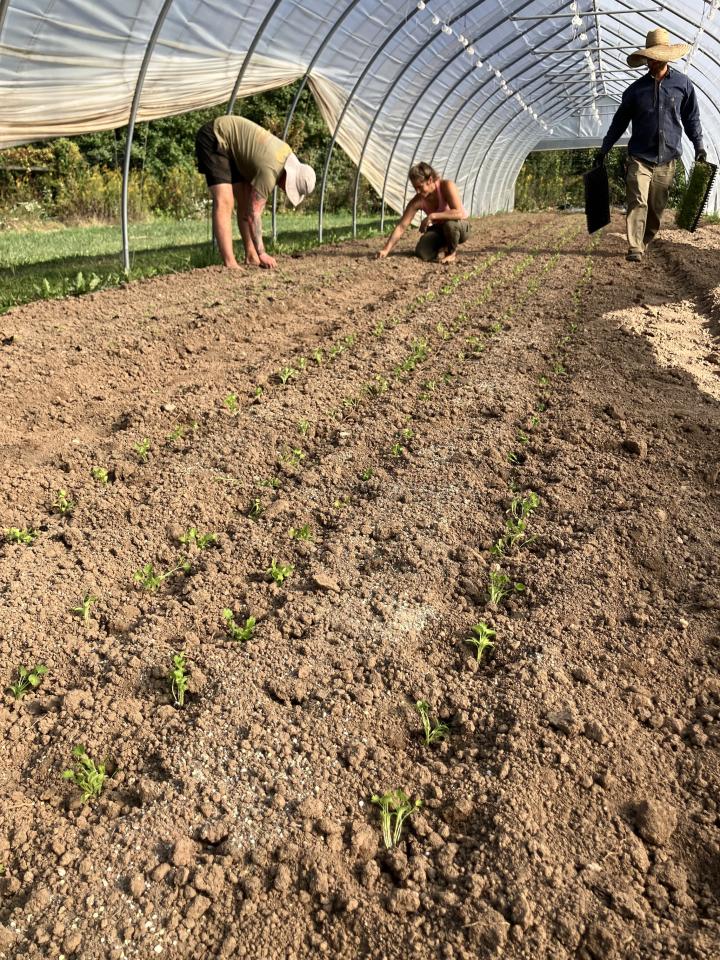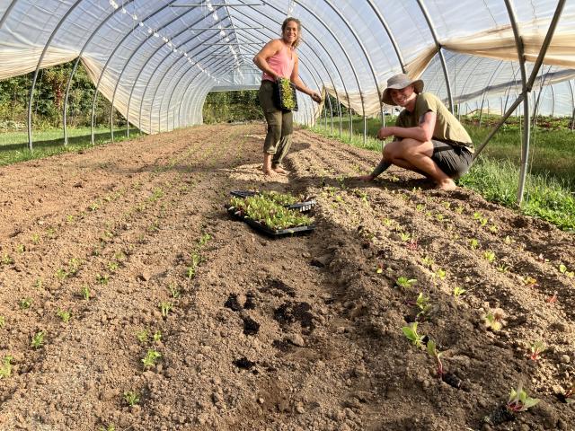 Farmers Gabby and Connor transplanting the final round of crops into the caterpillar tunnel last week.
