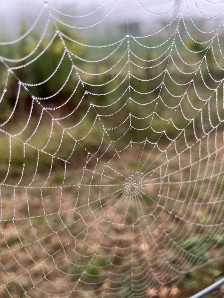 A collection of dewdrops on a spider's web.