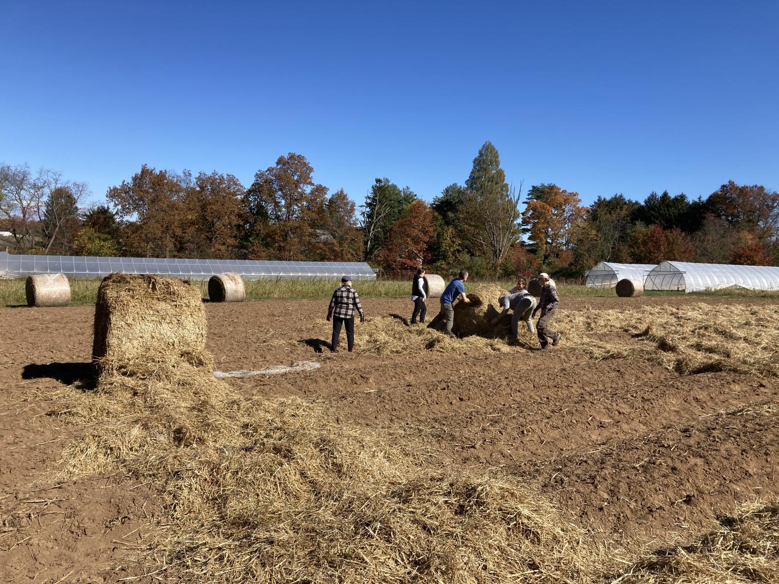 Covering the garlic beds with a thick layer of straw with the help of CSA members.